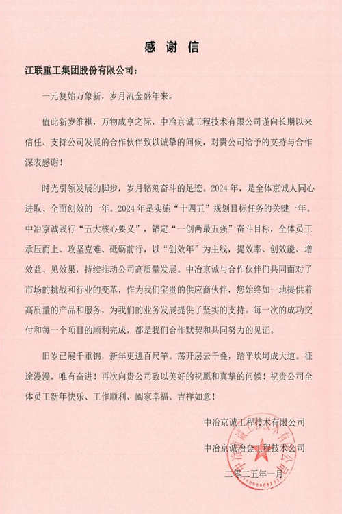 近日,公司收到了來自中冶京誠工程技術(shù)有限公司和中冶京誠冶金工程技術(shù)公司的聯(lián)名感謝信,對我司在九江鋼鐵超高溫亞臨界煤氣發(fā)電工程項目中的鼎力支持表示了感謝,并對我司在技術(shù)實力、項目管理以及質(zhì)量管控等方面的出色表現(xiàn)給予了高度評價。